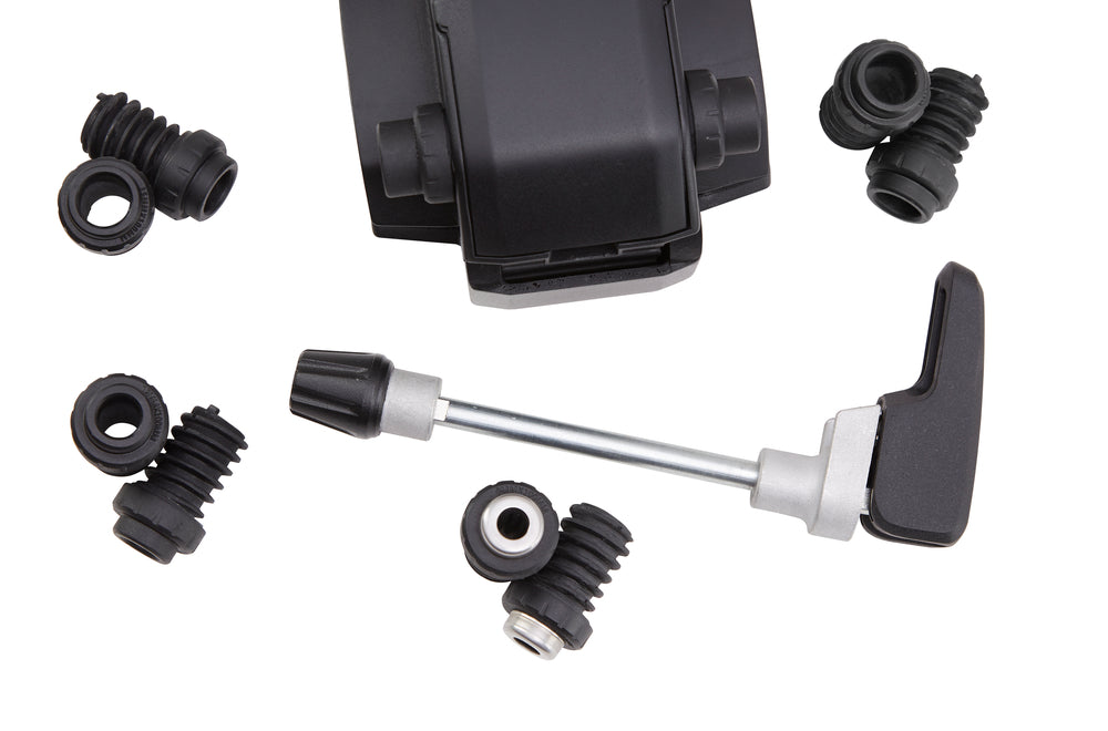 - Interchangeable inserts work with most axle configurations including quick release (9 mm) and thru-axles (12 x 100 mm, 15 x 100 mm, 15 x 110 mm, 15 x 135/142/150mm)