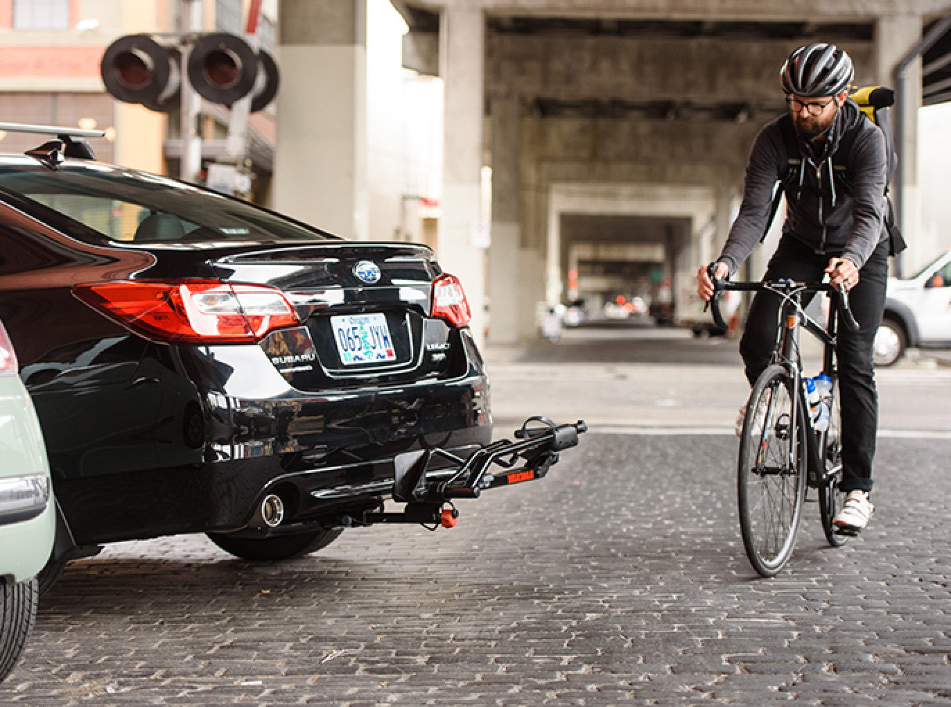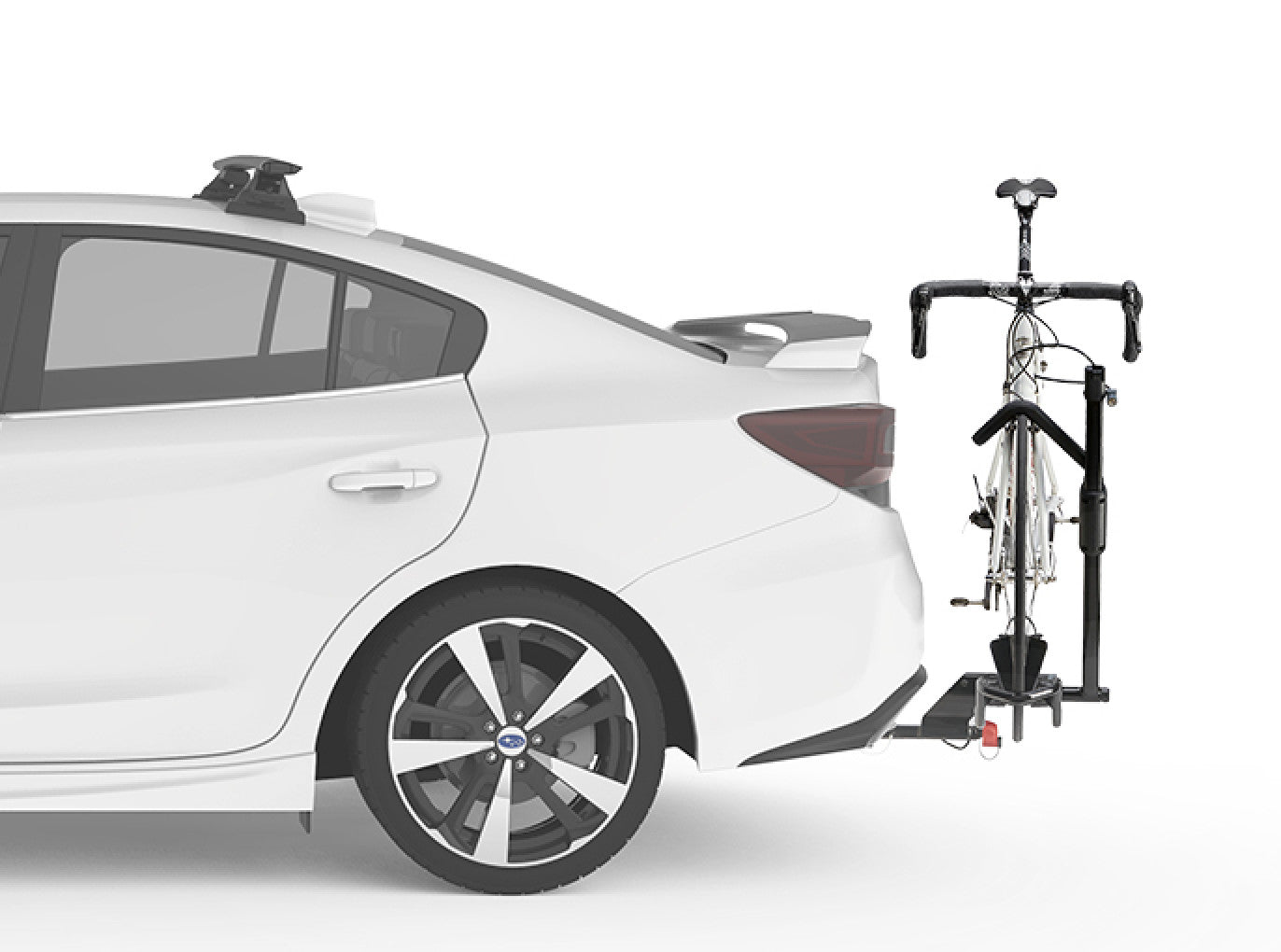 - Lightweight, hitch mounted tray rack that carries one bike without frame contact
