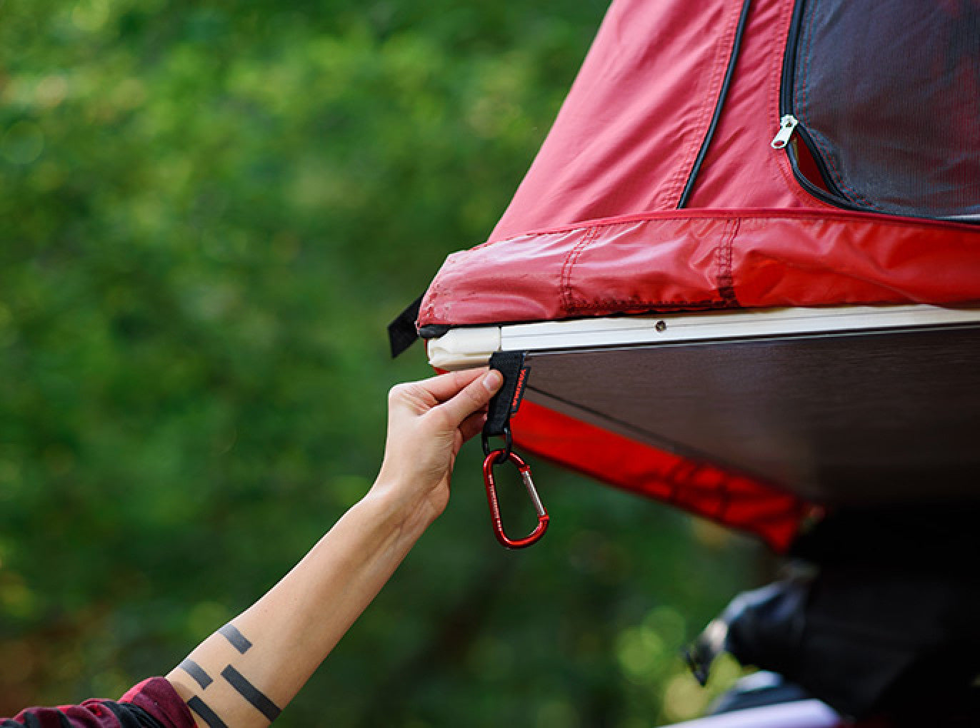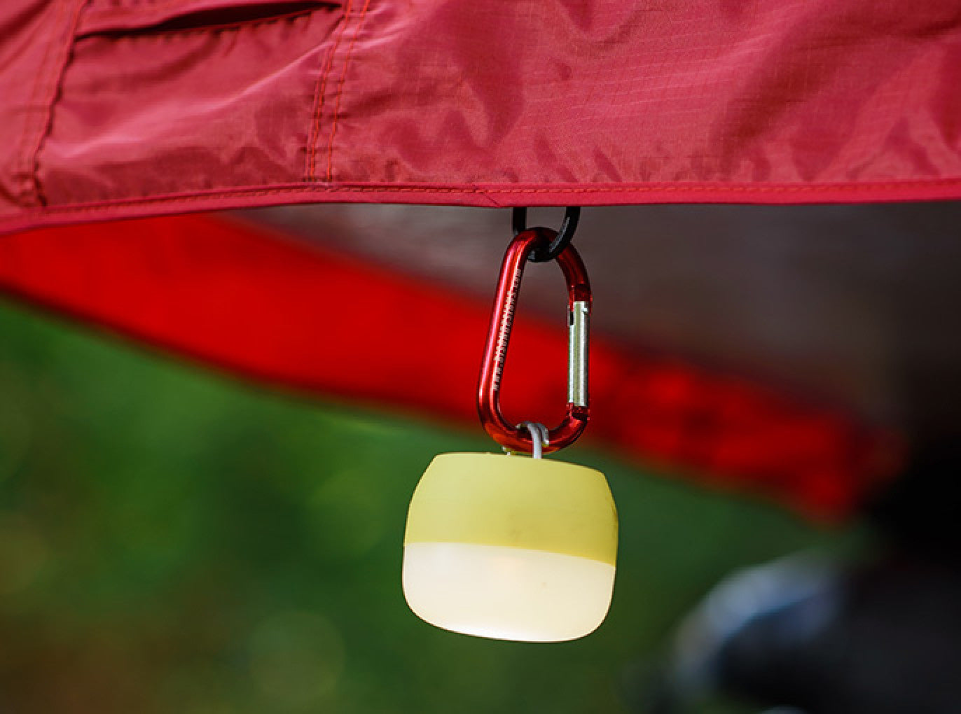 • Hang lamps, day packs, clothes from the carabiner or whatever you need to keep off the ground